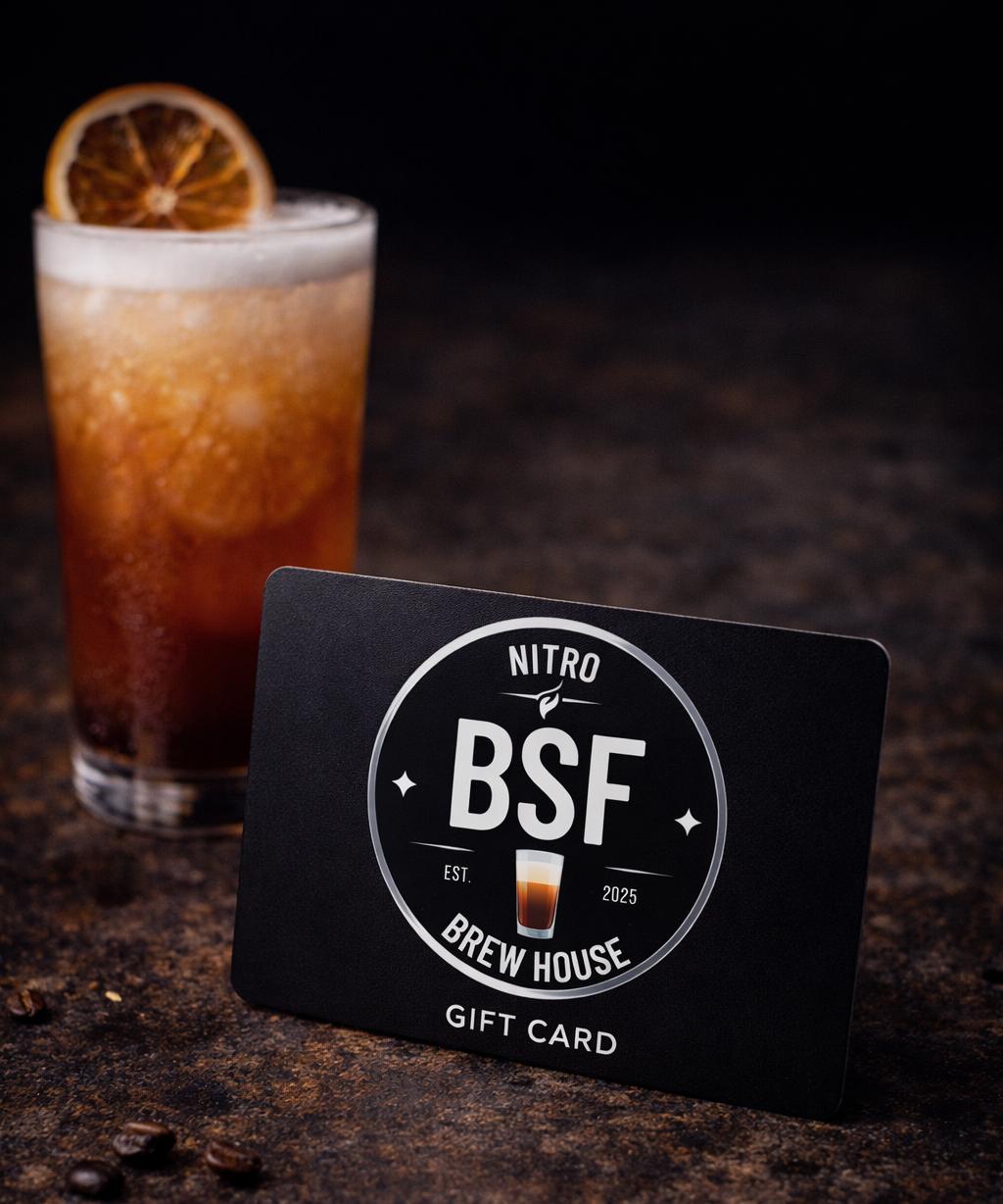 Not sure what to get them? Smooth it over with nitro. BSF Nitro Brew House gift cards are an easy win for coffee lovers, tea drinkers, salad fans, and anyone who appreciates a perfectly smooth pour. Available in any denomination and usable in-store or online.